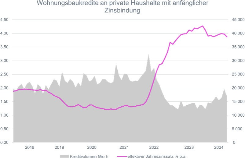 Die Kaufpreise für Ein- und Zweifamilienhäuser (EZFH) sowie für Eigentumswohnungen (ETW) sind in den vergangenen Jahren stetig angestiegen. Zahlen des German Real Estate Index zufolge erreichten die Preise für EZFH ihren Höhepunkt im ersten Quartal 2022, und die für ETW gipfelten im zweiten Quartal 2022. Insgesamt stiegen die Preise seit dem ersten Quartal 2015 um 107,9 Prozent (EZFH) beziehungsweise um 108,6 Prozent (ETW). Dies entspricht einer jährlichen Wachstumsrate von über 13 Prozent. Bis zum ersten Quartal 2024 fielen die Preise aufgrund steigender Zinsen zunächst etwas ab. Seither sind sie aber wieder um 5,2 Prozent (EZFH) und 3,6 Prozent (ETW) angestiegen. Zahlen der Deutschen Bundesbank zeigen, dass der Preisrückgang ab 2022 die Zinssteigerungen nicht vollständig kompensieren konnte. Wie die Grafik verdeutlicht, ging das Volumen der Wohnungsbaukredite (graue Fläche), die von deutschen Banken an private Haushalte ausgezahlt wurden, mit dem Zinsanstieg (pinkfarbene Linie) deutlich zurück. Die Zahl der Haushalte, die für die Eigentumsbildung einen Kredit bei einer Bank aufnahmen, war also rückläufig. Seit Ende 2023 stabilisiert sich die Situation allerdings wieder.
